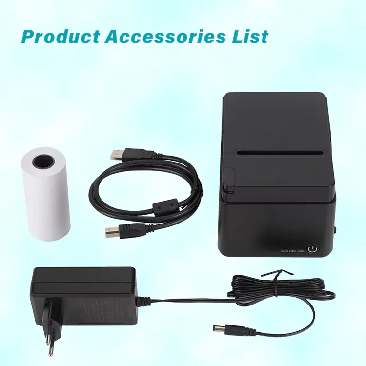 1.Пакетот вклучува: 80mm печатач за сметки, ролна хартија, USB кабел, прирачници, адаптер.
